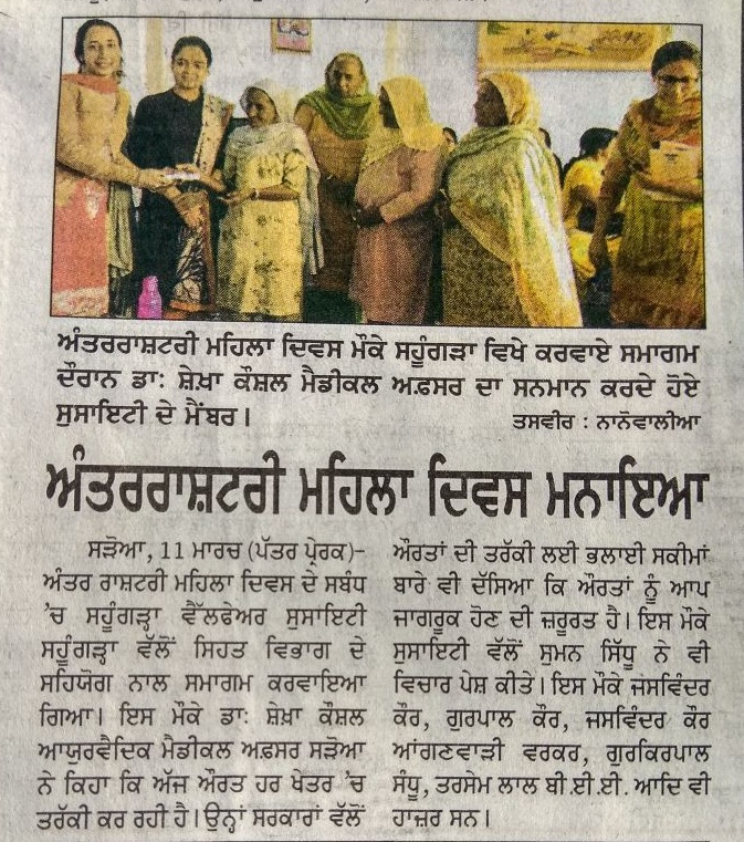 On dated 8th march 2018,Sahungra Welfare Society celebrates International women day in support to beti bachao beti padhao campaign in village Sahungra block Saroya,SBS Nagar at Shri Guru Ravidass Gurudwara Sahib.on this occasion madam Shikha Kaushal, Ayurvedica Medical Officer from Government civil hospital Saroya was present as chief guest. in this campaign, Madam Amandeep Kaur(ANM) and Gurpal Kaur(Asha Worker) flags off an awareness programme for ladies about different types of physical problem faced by them at different stages of life.Total 150+women participates on this campaign enthusiastically. The Society re presenter,Mrs Suman Sidhu honored the chief guest with shawl and a book. Breakfast is also arranged for all participants by Sahungra Welfare Society.